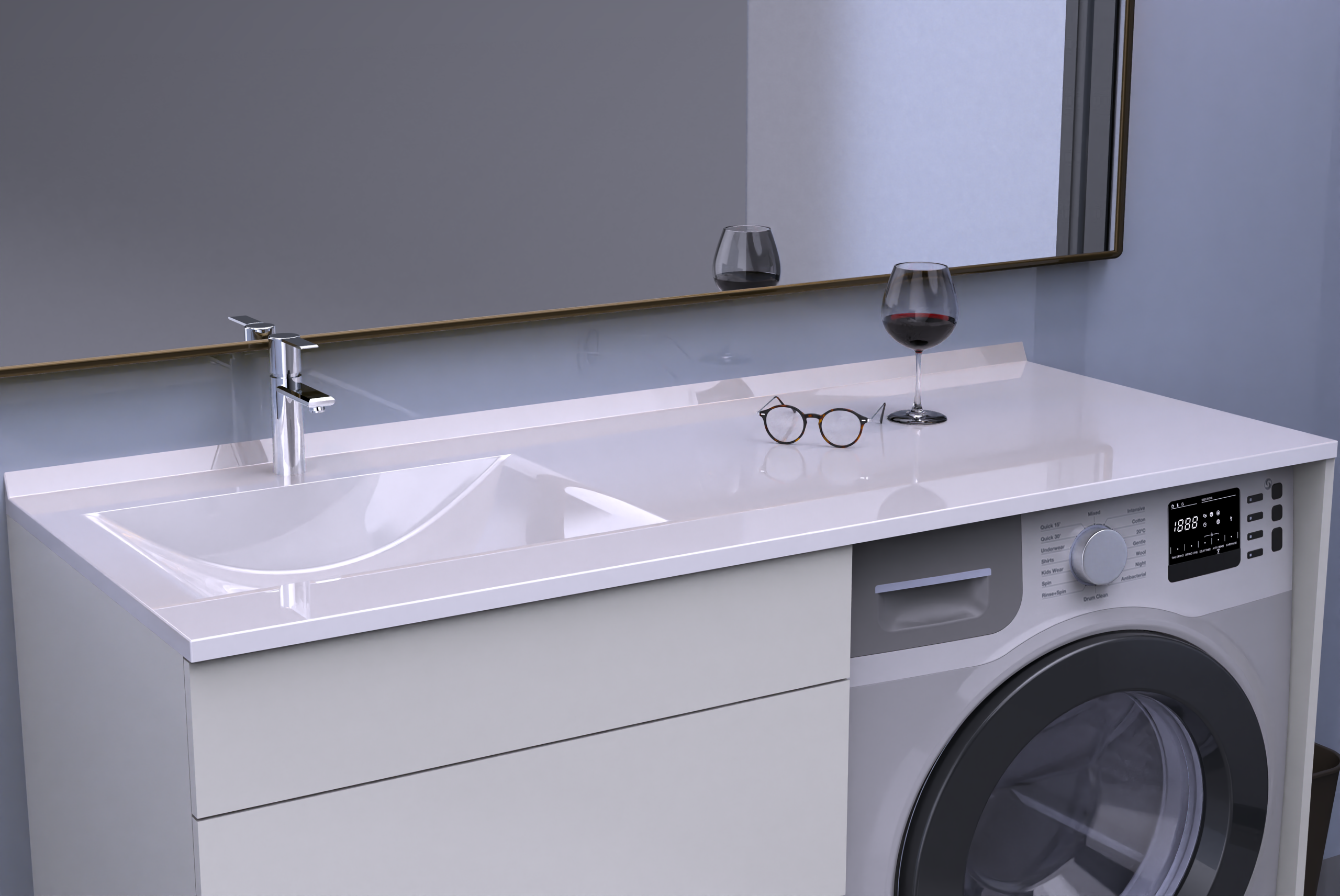 ➡ Stabilna konstrukcja na nóżkach – mebel osadzony na solidnych, metalowych nóżkach z regulacją wysokości – idealne rozwiązanie do wilgotnych pomieszczeń.